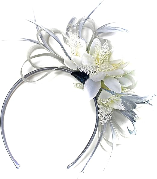 White And Silver Net Hoop Feather Hair Fascinator Headband Wedding